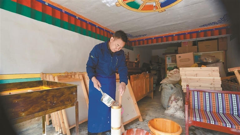 走进墨竹工卡县唐加乡罗杰林民族手工艺品加工专业合作社,记者看出,里边竟别有洞天,摆满了各种色彩的藏纸,有的光彩夺目,有的相对浓艳。为了愈加漂亮,部分五颜六色藏纸上还印有文字和图画。房间的另一边则摆放着由各种色彩的藏纸加工而成的笔记本、笔筒、抽纸盒等品种丰厚、样式新颖的工艺品。市市级非物质文明遗产第五代直贡嘎秀藏纸技艺传承人觉康就啊·阿旺曲央正带领学徒们调试新研制的藏纸染料——经改进后的藏纸呈现出细腻的皮质质感,兼具传统神韵与现代审美,让这门具有近千年前史的非遗技艺,在看护与立异中点亮了当地大众的增收路。