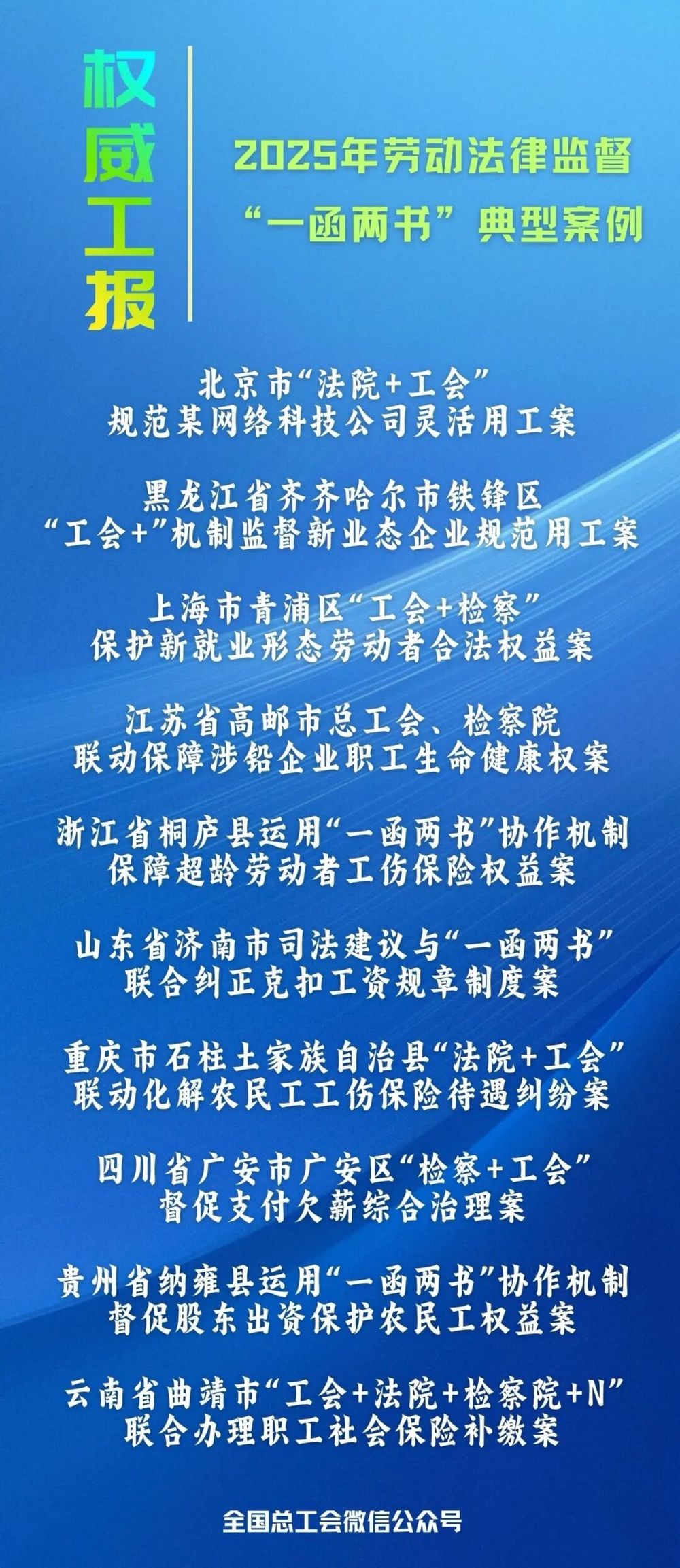 据“全国总工会”微信公众号消息,为深入学习贯彻习法治思想,贯彻落实党的二十届四中全会精神和中央全面依法治国工作会议精神,充分的发挥典型案例的示范、指导和引领作用,更好协同协作推进劳动法律监督“一函两书”,全国总工会与最高人民法院、最高人民检察院一同研究筛选了10个劳动法律监督“一函两书”典型案例,供参考借鉴。